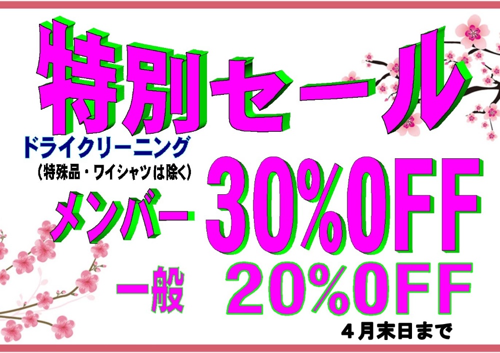 *会員様* 開店より13時までドライクリーニング(特殊品 、Yシャツ除く) 20㌫off13時より19時まで 10㌫off